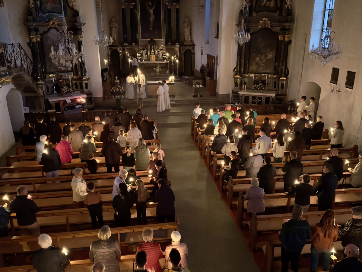 Keine Feier im Jahr ist so reich an Symbolen wie die Osternacht. Alles beginnt draussen, im Dunkeln, ein Feuer wird entzündet. Dieses Ritual verkündet den Sieg des Lebens über das Dunkle. Die Osterkerze wird am Feuer entzündet und leuchtet als Zeichen für Christus, das Licht der Welt. Von dieser einen Flamme breitet sich das Licht in die Kirche aus. Kerze um Kerze beginnt zu strahlen, und es entsteht ein Moment tiefer Verbundenheit, der viele Menschen jedes Jahr aufs Neue berührt.